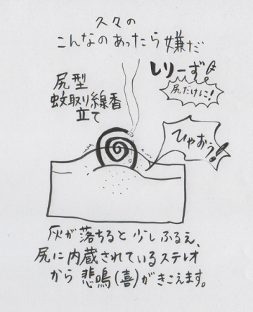 2012/08/26 Category : こんな○○嫌なんすけどシリーズ 久々の、こんな〇〇嫌なんすけどシリーズ こんばんは~。突然ですが、最近家に1センチくらいの小さな虫がたくさん出て悩んでいます。おそらくGの仲間なのではないかと思うんですが、触角がなんか違うかんじなんだよなあ・・・。エアコンが怪しいんだよなあ~。そこで、G対策用品を買いにドラッグストアへ!スプレーと置くタイプはあるので、入ってきたくなくなるようなのがいいのでは!と思い、とりあえず蚊取り線香を買ってみた!ん、で、す、が!いや~、1Kで使うには蚊取り線香は強烈すぎました・・・。部屋の中が煙で白っぽくなり、虫が入ってこないどころか自分もむせる・・・。部屋のものすべてが蚊取り線香のにおいになり、目痛くてが開けれなくなる事態に・・・。しかしたまたまかもしれないのですが、今日はなんだか見かけないぞ~!いい感じ!まだ油断はしないがな!!とまあ、そんな感じで蚊取り線香に関連した絵でも描くか~と思ったのですが、何気に描いたイラストが、『こんな〇〇嫌なんすけどシリーズ』にできそうだったので、そうしてみました。『こんな〇〇嫌なんすけどシリーズ その4』う~ん、毎度、支離滅裂ですみません!!尻だけに!!←言いたいだけいや~、久々すぎて、タイトル間違ってたな~。『こんな〇〇嫌なんすけどシリーズ』ってなんだ?という方はこちらをどうぞ!画面左側のカテゴリからも見ることができますのでよければ~!ブリーフトランプ、アツかったなぁ・・・!前よりは虫平気なってきましたが、家に出るのはやっぱ嫌だ~。今日は、同僚のお家に遊びに行ってきたり、高校時代の友人と新宿のインド料理屋さんでカレー食べてきたりしました~。たまたま行ったら、ベリーダンスのショーが始まって、美女見放題で楽しかったす~!(鼻血)それはまた後日~!!ではではまた~!!↑ランキング参加してます。余裕のあるときに応援よろしくおねがいします~ [4回]