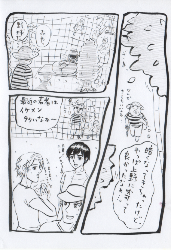 2012/07/25 Category : にっき 休日まとめ その2 ~上野~ こんばんは~。前回の日記から日が空いてしまいましたが…今回は上野編を!夕方、公園で一休みするためか、仕事帰りのサラリーマンさんがちらほらビール片手に公園に向かう階段を上っていた。お仕事お疲れ様です!!仕事帰りに上野公園に立ち寄れるなんて羨ましいですな~。西郷さんとワンさん。いや~、暗すぎて見えない!!次回リベンジしたいなこりゃ。(汗)野球場で大学生だと思われる方々が野球をしていた。なんだろう、最近の若者はイケメン率が高いのか、まるでドラマのようなメンツである。クリックすると大きくなります!そして女子マネージャーのクオリティの高さ。若い熱気が新鮮で、しばらく眺めているとカキィィィィン!!!ホームランだ!野球場を囲う高いネットも軽々越えて飛んでいった。その瞬間、じめじめした空気とベンチに寝っころがってるホームレスのおっさん、汗でべったりしているわたしとライトのついた夜の野球場がひとつになった…気がした。(完全に気のせいです。)ホームランをみたら暑くてだるかったのも、なんだかふっとんだ!ありがとう若者達よ!!と、野球場を後にした。かなり歩いて疲れてきたので休憩。噴水の近くにいつのまにかスタバさんができていた!本当はビールが飲みたかったが、シャレ乙ぶって抹茶フラペチーノをテイクアウト。スタバさんの黒板はどのお店もかっこいいですが、さすが芸大生の行き交うカフェ!!芸大生さんが描いたメニューや黒板が洒落ていました!写真OKだったので撮らせていただきやした。上野を凝縮~。これどのくらい時間かけているんだろう…。すごいな~。次はどんな絵が描いてあるか楽しみだなぁ。そんなこんなでシャレ乙な抹茶フラペチーノを持って噴水前のベンチで一休み。静か~。おなかがすいたので浅草の豆腐屋さんで買ったおぼろ豆腐と、えび湯葉巻きをいただくことに。あ~、やっぱビールにしときゃあ良かった。(涙)おぼろ豆腐。なんとも美しい!そしておいしい!!フラペチーノのスプーンでいただいた。フラペチーノのクリームが豆腐のうまさを半減させる。(涙)噴水~。時間がくると噴水ショーがはじまります。夜はライトアップされてとてもきれいです。二時間ちかく噴水前でくつろいでいたのでかなり堪能できました!YES!いや~、楽しい一日でした~。上野は夏のうちにもう一度行きたい!!ああ…イラストまにあわねえです…。掃除したときにパソコンとスキャナーを離して置いてしまったもんで、スキャンするのが厄介でして…。う~ん。どうしたもんか…。イラストブログに所属しているのに、最近立て続けにイラストなくてすみません…。やべ、デネブさんにあきれられてる!!明日帰宅したらできるといいんだが…。あしたは、高校のときの友人と数年ぶりに会ってきます!その後、銀座ですきな写真家さんが展示会しているので行ってきたいと思います!う~ん、リア充ですな。ではでは! [3回]