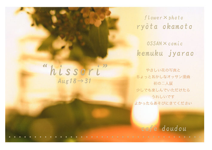 2008/08/27 Category : もんじゃらげ通信 初!祝!二人展『hissori』 みなさんこんばんは、そしておはようございます、はたまたこんにちは!ここ数日涼しく過ごしやすいですが(雨だけど…)、いかがお過ごしでしょうか?毛むくはというと、人生初のおっさん漫画の展示会を8月18日から横浜市のカフェで開催中です!!(知らせるの遅ーっ!!)二人展『hissori』…岡本氏が撮った優しいお花の写真と、毛むくが描いたおっさん漫画を展示させていただいております。壁に写真、棚の隅に漫画。花とおっさん…真逆な感じが気に入ってます。祝、第一回なのに、漫画間に合わず、たった話二つしか描けなかった…予定では三冊置きたかったのですが、一冊に…まさに『ひっそり』展になってしまいましたが、岡本氏の壁一面のやさしい写真により助かりました、ほんとありがとう!!感想ノートも置かせてもらったんですが、なんのコメントもなかったらどうしよう…とか、つまらないぜ!とか書いてあったら…とか思って一度も展示会行けてません…。明日こそ見に行きたいと思います!!友達以外に生漫画を見ていただくのは初めてで、緊張しますが、感想が聞いてみたくてやった展示会なので、いろんな感想が聞けたらいいなあ。うれしい感想も、厳しい感想も!!お洒落でかわいいカフェに下品なおっさん漫画を…お食事中だった方ほんとすいません…。漫画を置かせてくださった店長さんありがとうございます!!そして一緒に二人展をやろう!と誘ってくれた心優しき岡本氏!ありがとう!!ま、またやれるといいね!!冬にでも!!次こそは数冊用意するぞー!!あと残りわずかですが、よかったら是非!!・・・二人展『hissori』・・・期間 8.18(mon)〜8.31(sun)場所 cafe doudou(横浜市 東急東横線白楽駅 徒歩数秒)*駅出て改札の目の前に看板が出ているのですぐわかります!おいしい飲み物と食べ物、気さくな店長さん、かわいいお店、展示期間が終わっても是非ー!!人気ブログランキングへ↑クリックお願いしたいですー! [0回]