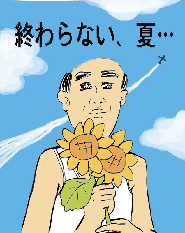 2008/08/23 Category : こんな○○嫌なんすけどシリーズ ひまわり畑にいってきました〜 お久しぶりでございます!昨日は久々に休みだったので、横浜にある、ひまわり畑にいってきました〜!ひまわりはいいですね、元気がでますね。茎とかすんごい丈夫そう。おおきな花すごい。曇り空だったため、夏!という感じではなかったのですが、すずしくて心地よい日でした。なんかやっと、夏らしい事できて嬉しかったなあ。この夏はずっと働いていた気がするなあ〜。学生さん達は夏休みがそろそろ終わってしまいますね。宿題ラストスパート頑張ってくださーい!!セミも一生懸命ないてるなあ、セミの声って気になると「うおー、鳴いてるぜー!耳イテー!!」ってかんじだけど、ボーっとしてると夏に溶け込んでぜんぜん聞こえない。気にならない。不思議だ。あと少しがんばってください。わたしもなんとか頑張りまっす。突然ですが…《こんな○○イヤだぞシリーズ1》こんな一休さん嫌…一休さんがこんな風に成長したら悲しい…。そしてふき出しの中にどんな言葉を当てはめても切ない感じになります。ためしに何か当てはめてみてください…。やっぱランニングとブリーフは最強装備だな…。かないません。人気ブログランキングへ↑クリックお願いしますっ!! [0回]
