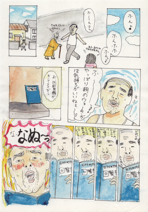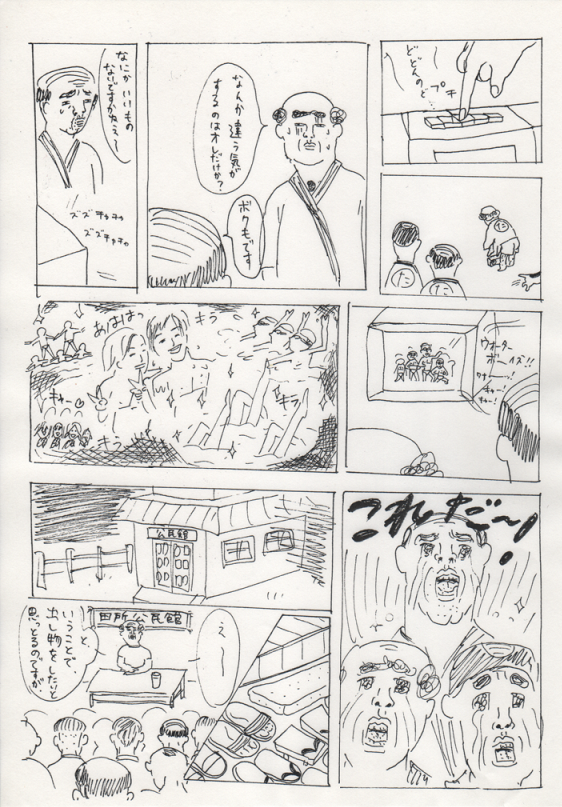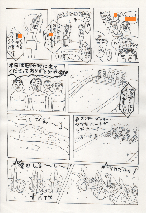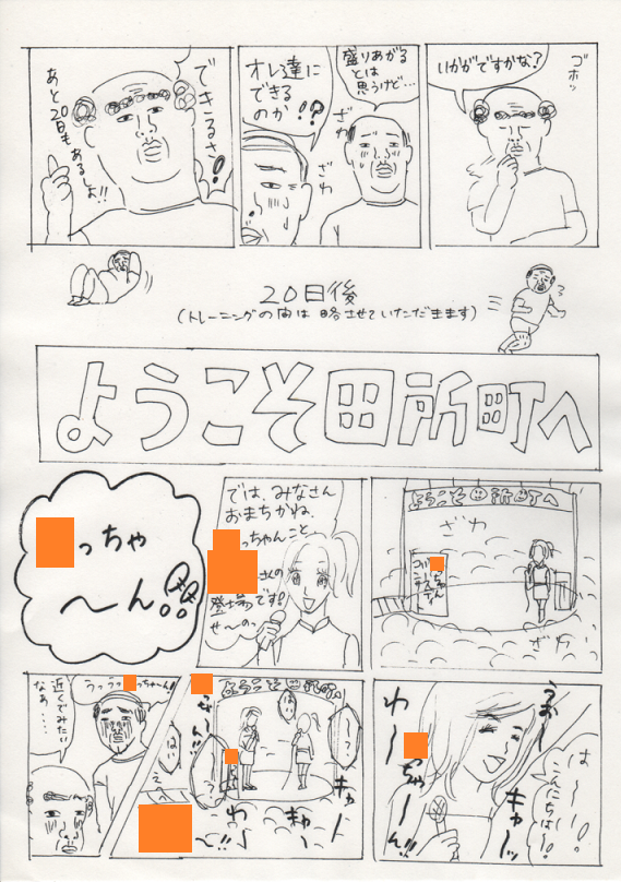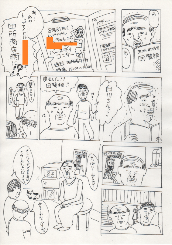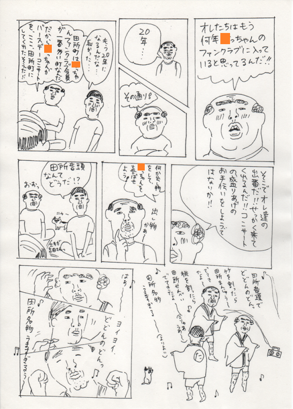 2013/02/01 Category : にっき 田所町内会まんが~アイドルが、俺らの町へやってきた!~ こんばんは~、昼前に腹に付けたホッカイロがまだあたたかい。約14時間。こんな小さいのに、驚異的な保温力!さて、今日は、昨日のひどい漫画の続きを恥ずかしげもなく公開したいと思います。こんなものを友人の誕生日に送りつけようとしていたなんてね…。しかも、20歳の誕生日に渡しそびれて、24歳の時もトライしようとしたっていうね…。そして結局渡せてないっていうね…。思えばこれがトーンデビューだった…!クリックすると大きくなります。オレンジ色のところには友人の名前が入ります。友人は主人公のおじさんたちが大好きなアイドルという設定です。絵の雑さがはんぱないですが、もし良かったら…。 あちゃ~。わたしは 田所 という響きが無性に好きでよく使います。町内会という狭いコミュニティ。ぼろい小さな公民館。いいですよね~。…この漫画をあげようとしていた友達に、いったい何歳の誕生日で渡すことができるのだろう…。10年経っても、まだまだ渡す気でいるわたしなのであった…。(気の毒な友人である)あ、だめだ、睡魔きた睡魔!おやすみなさい!ではまた~! [1回]